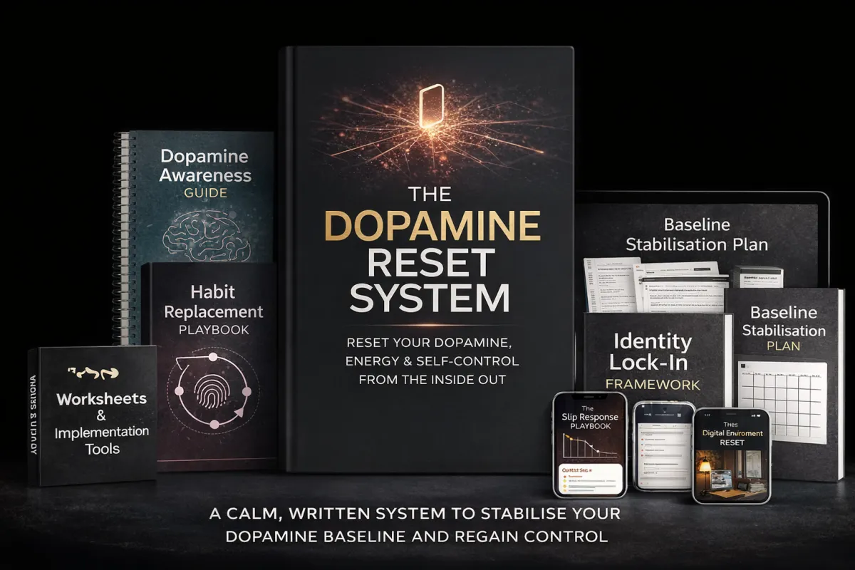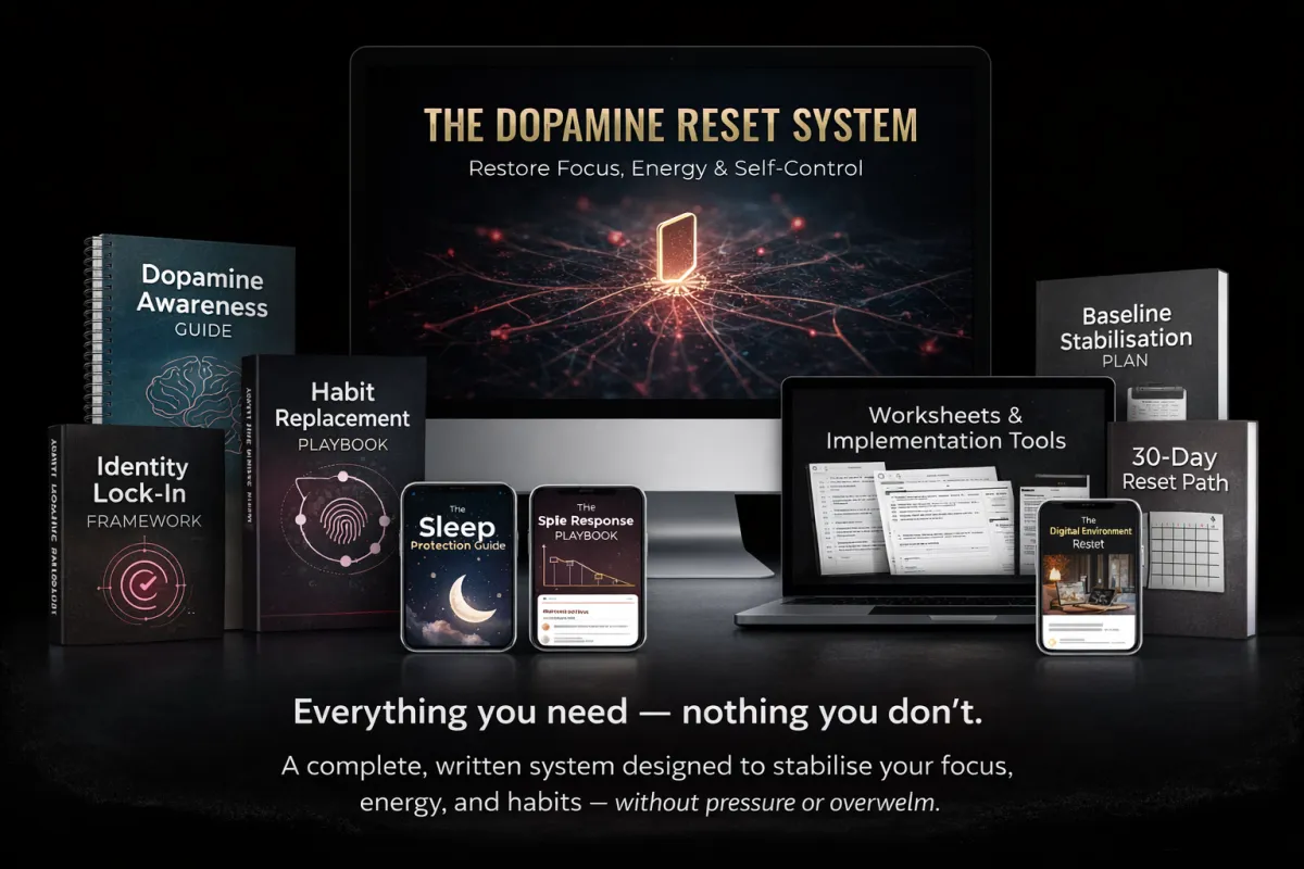 You’ll get instant access to The Dopamine Reset System, a structured written course built around 6 core pillars, plus several practical bonus modules.