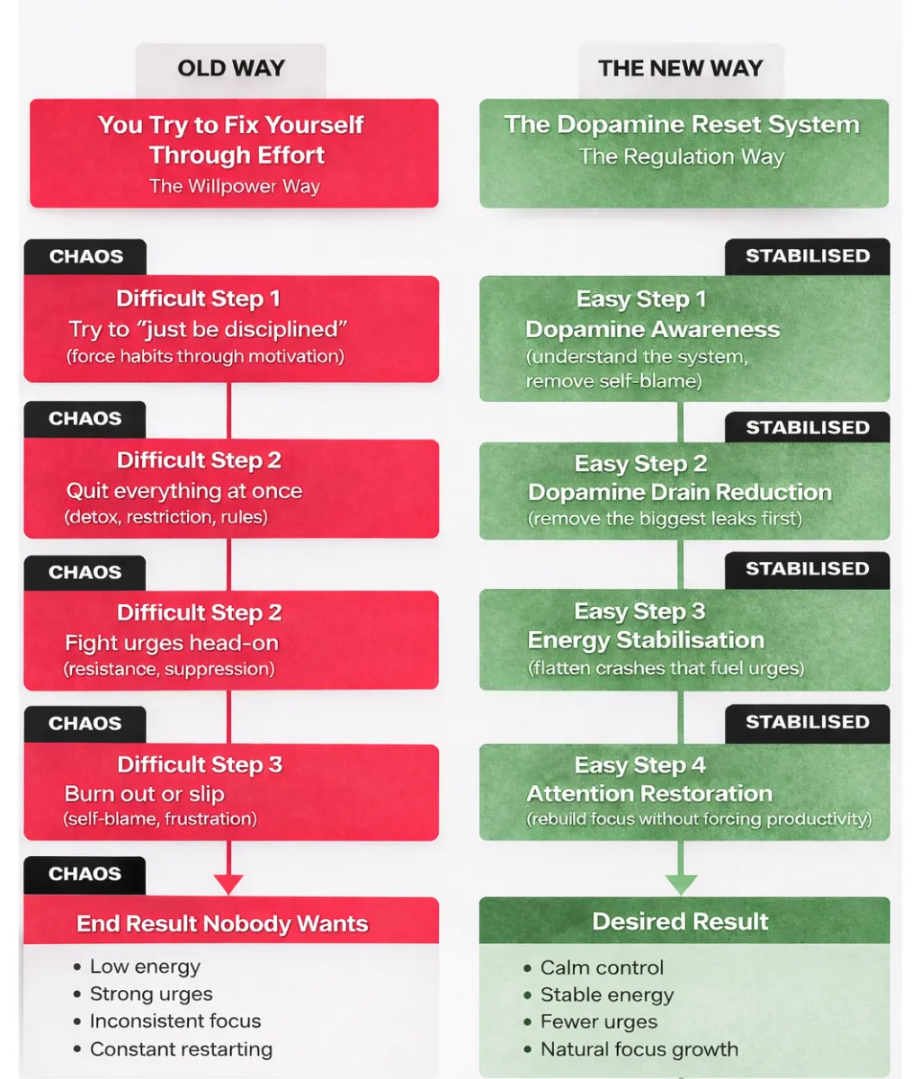 Instead of relying on willpower, motivation, or extreme rules, the system focuses on: Dopamine regulation, energy stabilisation, attention restoration, habit replacement and identity lock-in. When those foundations are addressed, behaviour change becomes easier and more reliable.